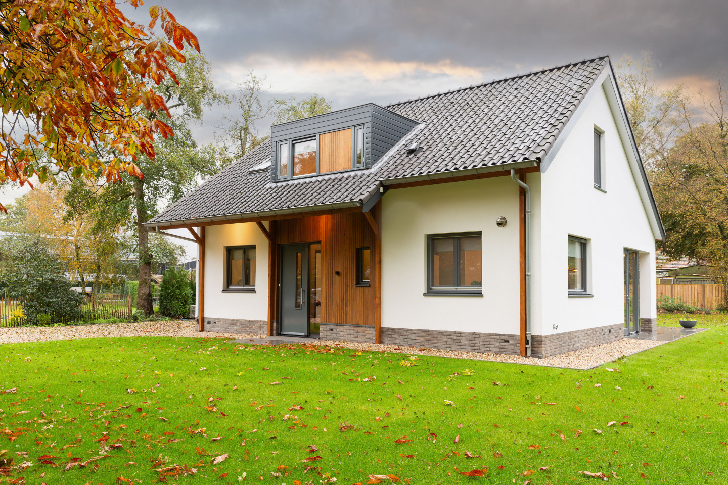 De materialen hebben een frisse en natuurlijke uitstraling. De wandafwerking is in overwegend uitgevoerd in wit stucwerk gecombineerd met houten gevelvlakken. Als plint is er gekozen voor een donkere steen met ‘wasserstrich’ afwerking. Door de smalle plankbreedte van de verticale gevelbekleding ontstaat een eigentijds beeld. De houten constructie, waar de overstekken op rusten, is in dezelfde kleur behandeld als de gevelbekleding. De keramische dakpannen zijn klassiek van vorm, wat het landelijke karakter van de woning versterkt.