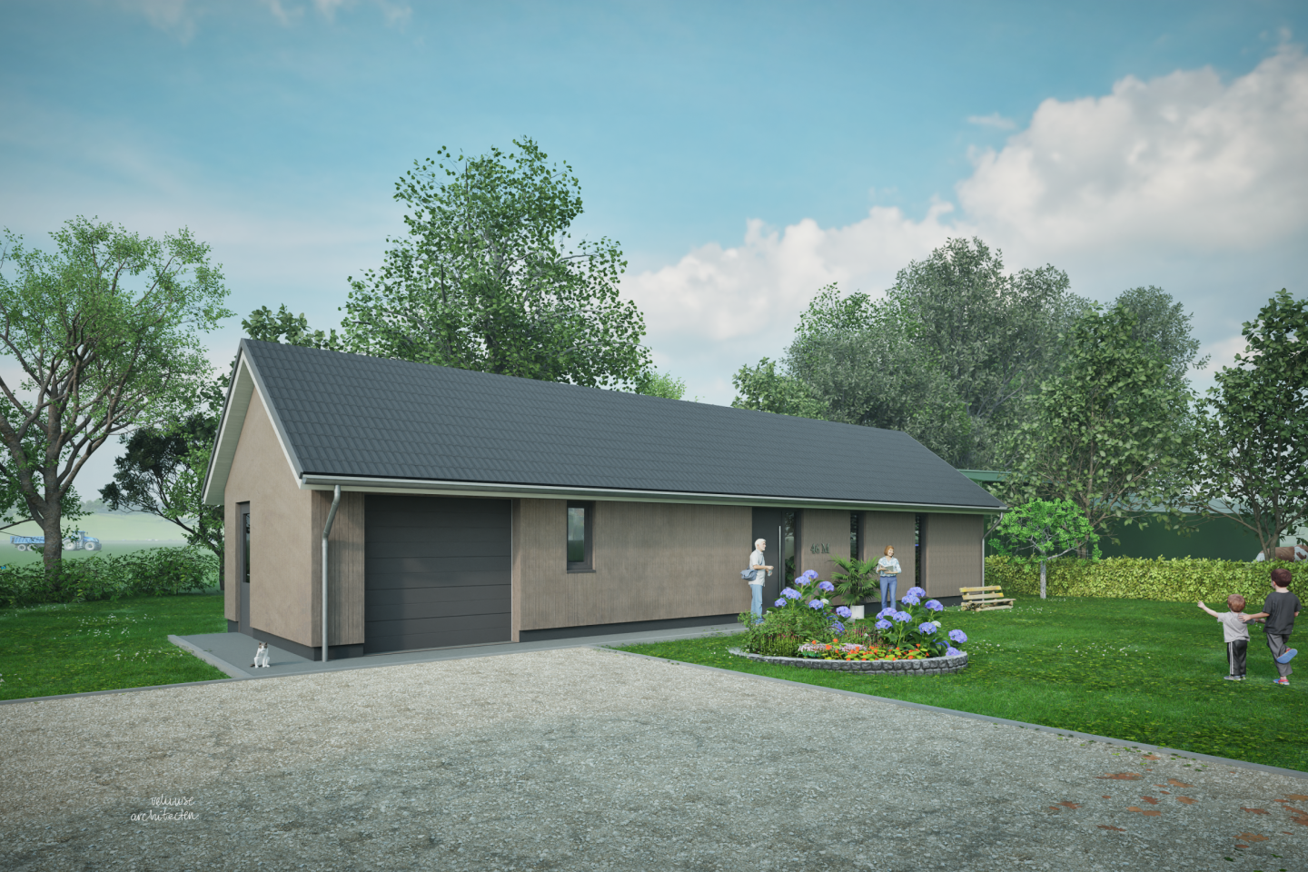 Op het agrarisch erf is eenvoud een kwaliteit. De woning sluit daar naadloos op aan met een helder schuurvolume en een logische positie op het erf. In de leefruimtes is gekozen voor open ruimte zonder plafond boven de slaapkamer en woonkamer, waardoor de woning verrassend licht en ruimtelijk aanvoelt. De natte groep is centraal in de woning geplaatst, met een compacte zolder. De efficiënte plattegrond houdt hierdoor maximale manoeuvreerruimte vrij, zodat de woning ook bij veranderende zorgvragen comfortabel blijft.