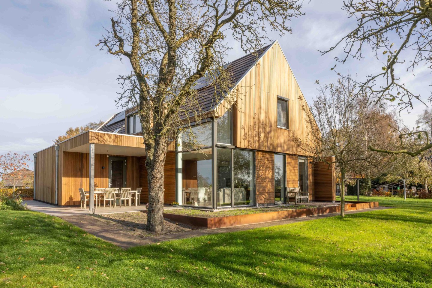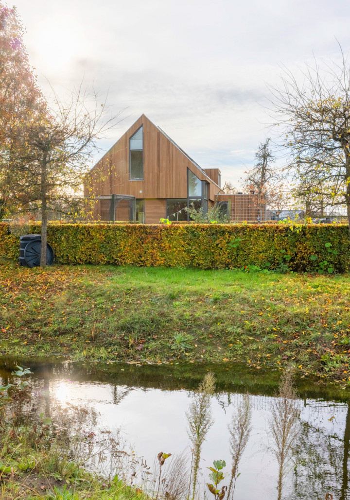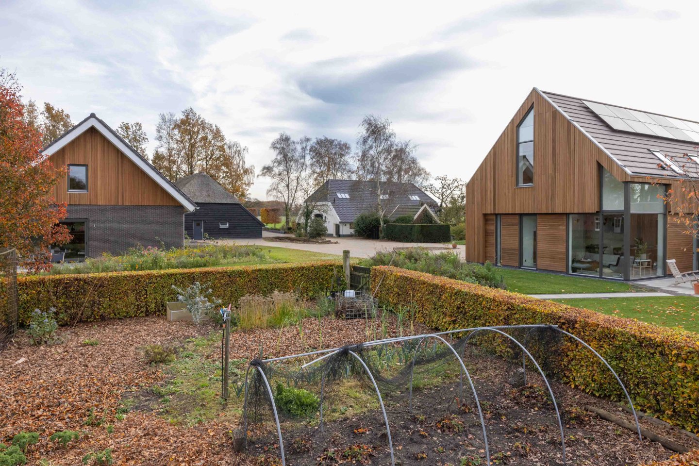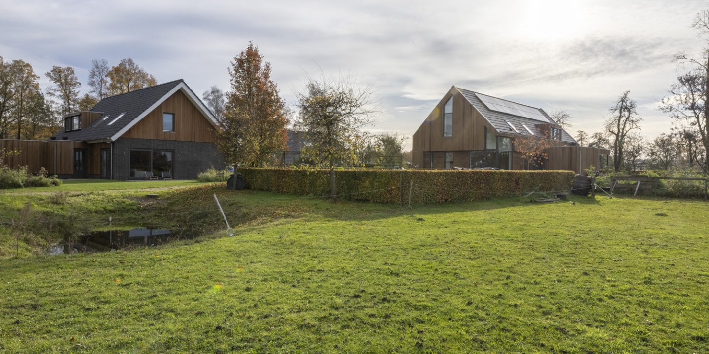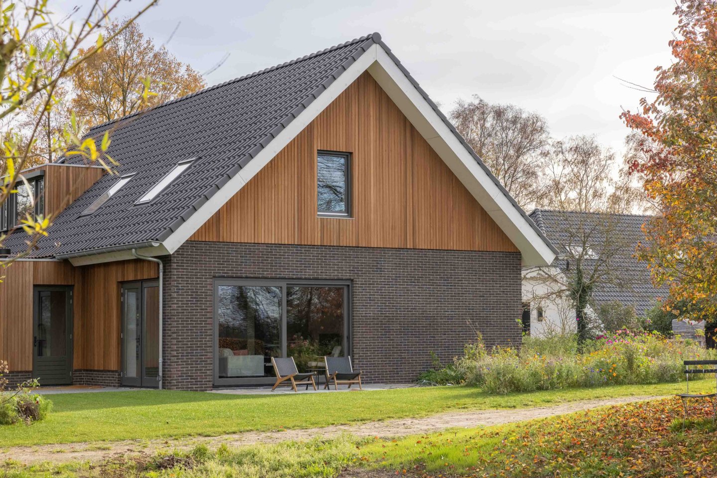 De twee-onder-één-kapwoning op het achtererf heeft een meer eigentijdse uitstraling. Deze woningen zijn ontworpen zonder overstekken en volledig uitgevoerd in hout. Hier ligt een bijzondere focus op duurzaamheid, met aandacht voor hergebruik, materiaalkeuze en installaties.