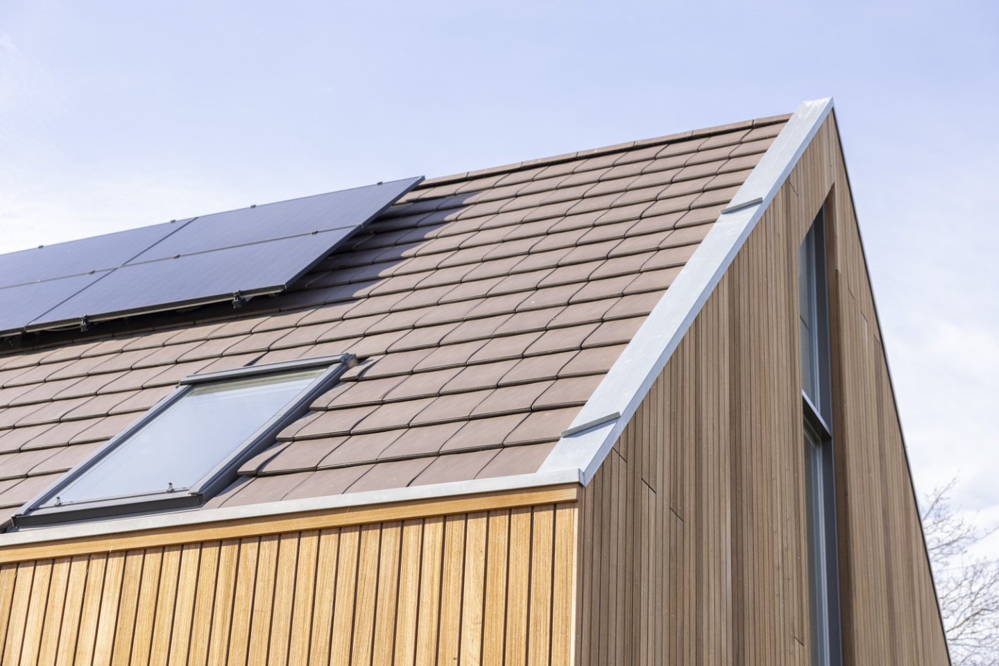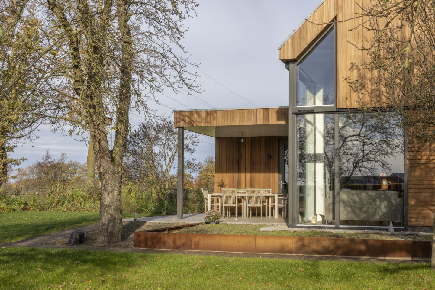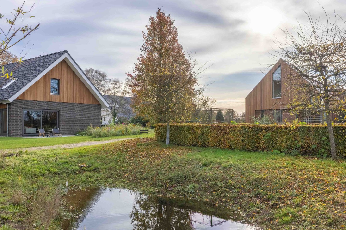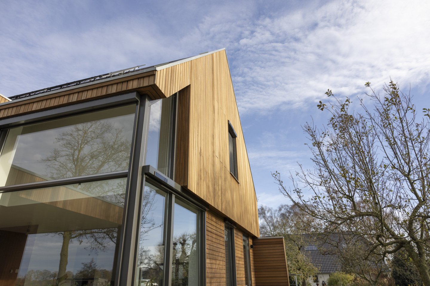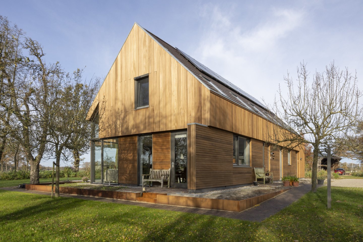 De twee-onder-één-kapwoning op het achtererf heeft een meer eigentijdse uitstraling. Deze woningen zijn ontworpen zonder overstekken en volledig uitgevoerd in hout. Hier ligt een bijzondere focus op duurzaamheid, met aandacht voor hergebruik, materiaalkeuze en installaties.