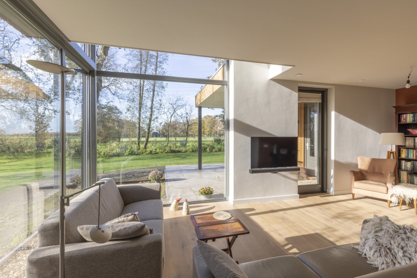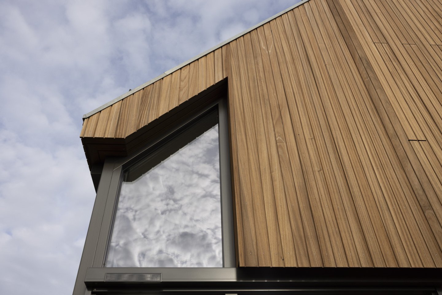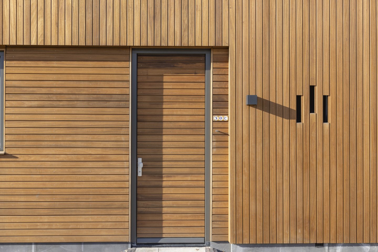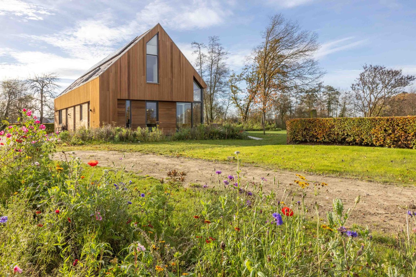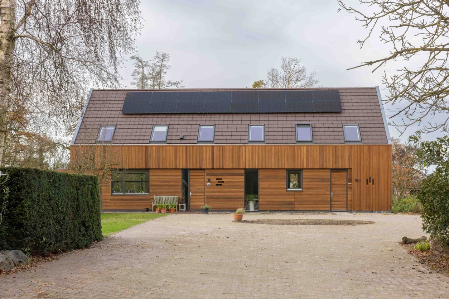 De twee-onder-één-kapwoning op het achtererf heeft een meer eigentijdse uitstraling. Deze woningen zijn ontworpen zonder overstekken en volledig uitgevoerd in hout. Hier ligt een bijzondere focus op duurzaamheid, met aandacht voor hergebruik, materiaalkeuze en installaties.