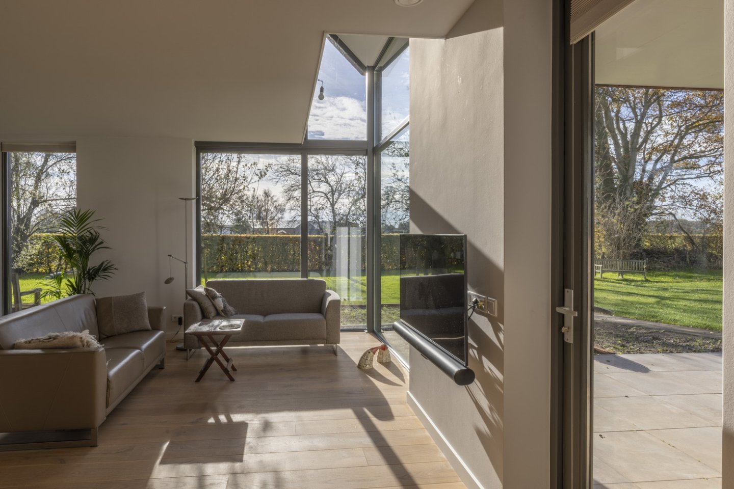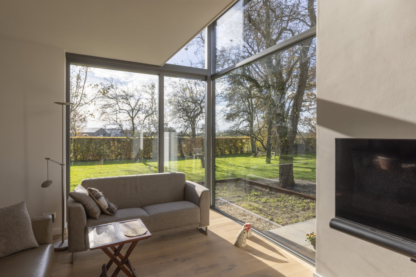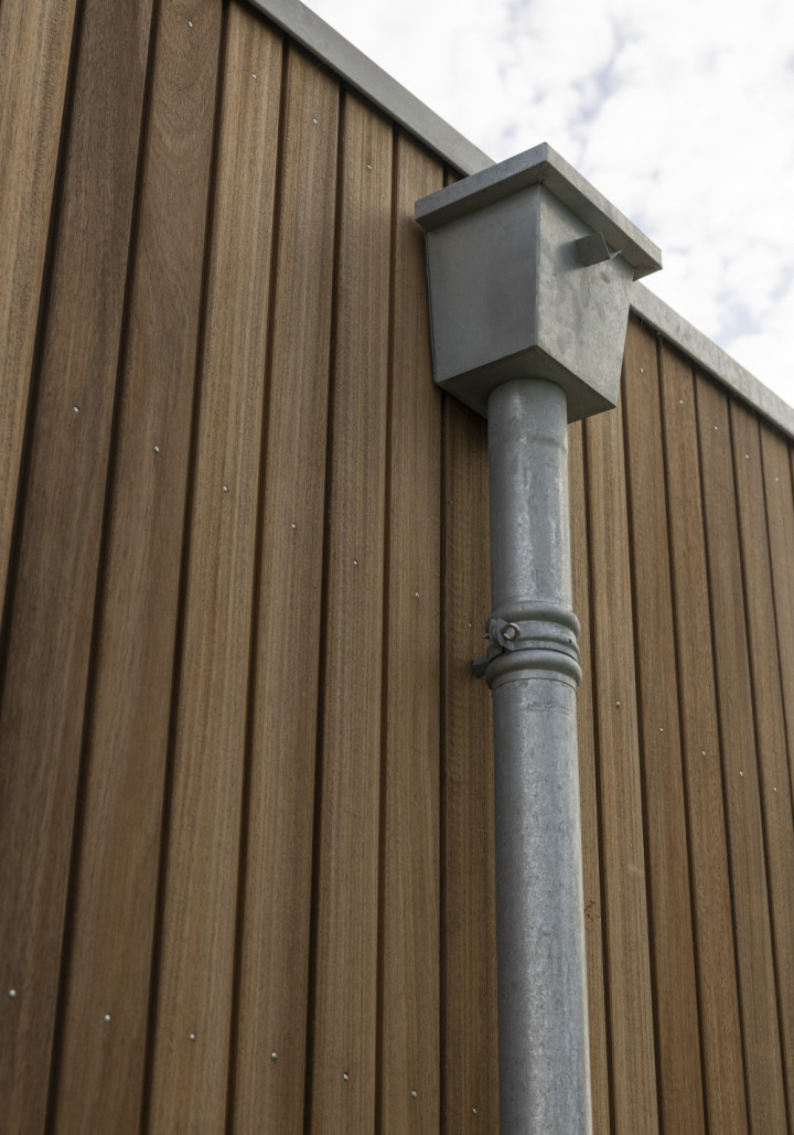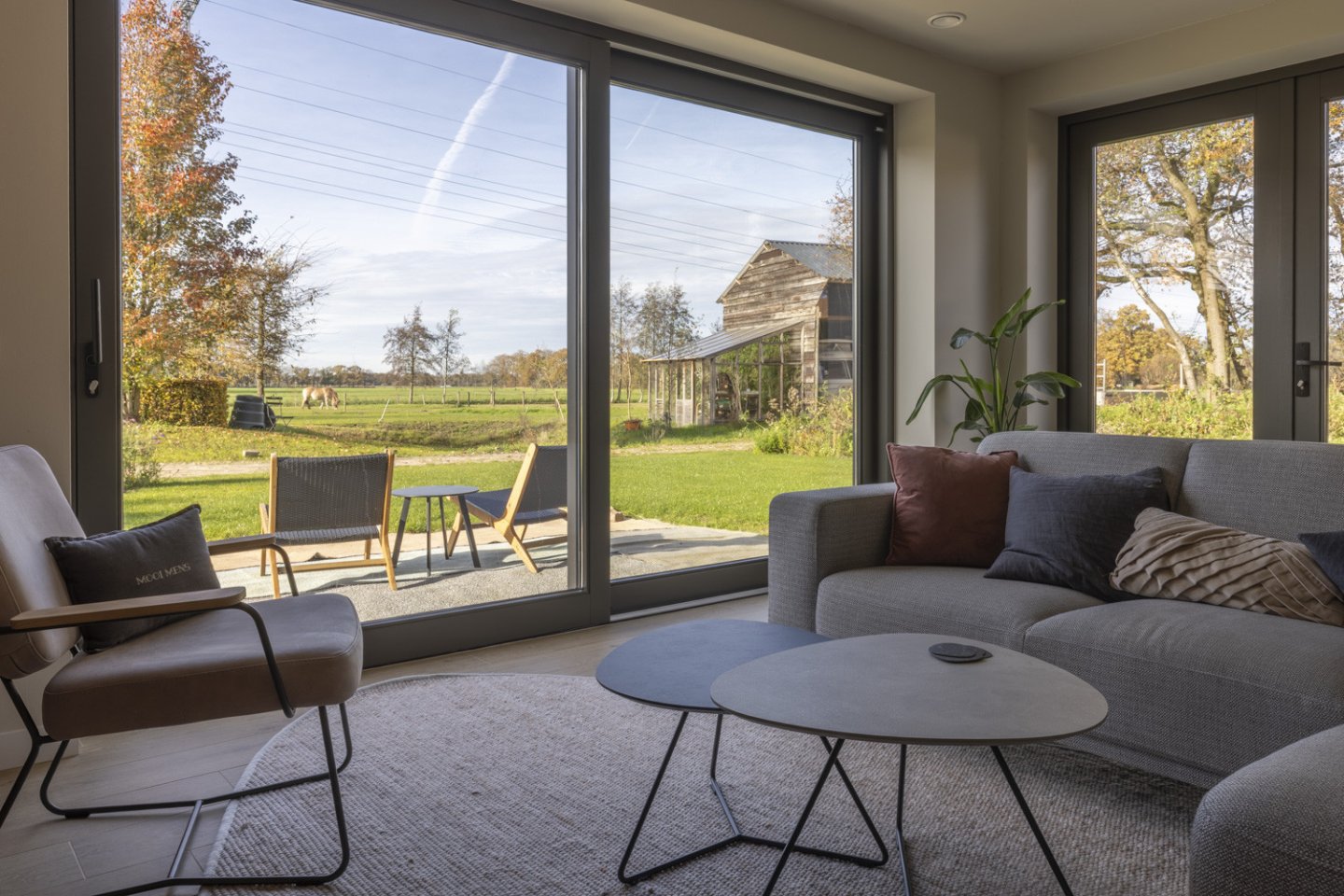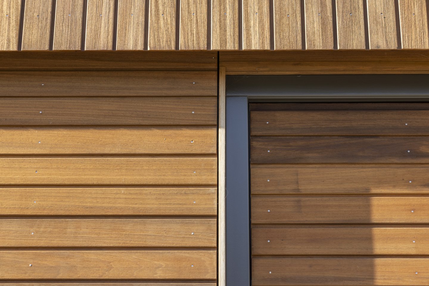 De twee-onder-één-kapwoning op het achtererf heeft een meer eigentijdse uitstraling. Deze woningen zijn ontworpen zonder overstekken en volledig uitgevoerd in hout. Hier ligt een bijzondere focus op duurzaamheid, met aandacht voor hergebruik, materiaalkeuze en installaties.