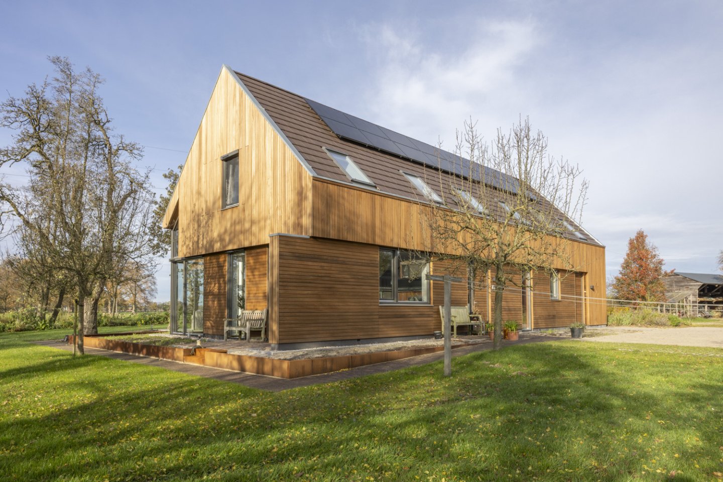 De architectuur van de nieuwe woningen is sterk verbonden met hun positie op het erf. De twee-onder-één-kapwoningen achter de authentieke schuur hebben een lage gootlijn en een royaal overstek. De sterk golvende dakpan sluit aan bij het klassieke karakter van de schuur en voegt tegelijkertijd een eigentijdse laag toe. De gevels zijn uitgevoerd in een donkere metselsteen en verduurzaamd hout.