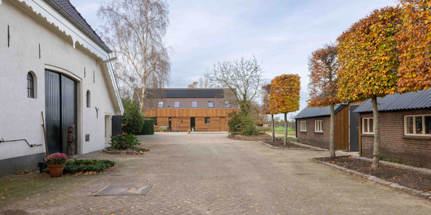 Aan de Nijkerkerweg is een voormalig agrarisch erf getransformeerd naar een toekomstbestendige woonomgeving. Vervallen nertsenschuren en opstallen van een hoveniersbedrijf zijn gesaneerd, waardoor ruimte is ontstaan voor vijf nieuwe woningen. De bestaande bedrijfswoningen zijn gehandhaafd en vormen samen met de nieuwbouw twee herkenbare woonerven.