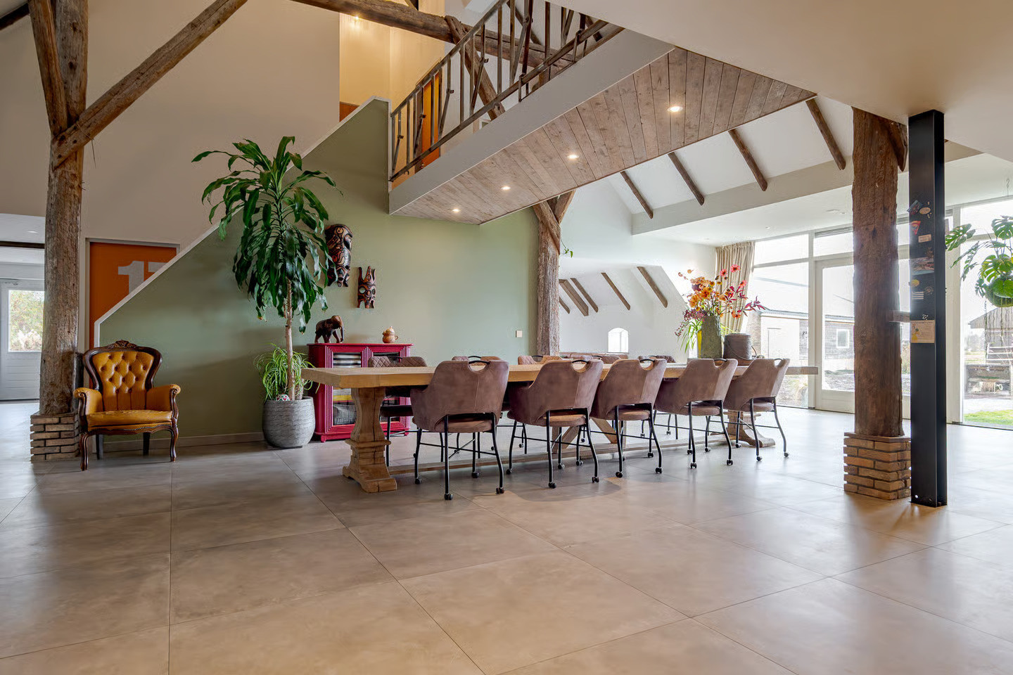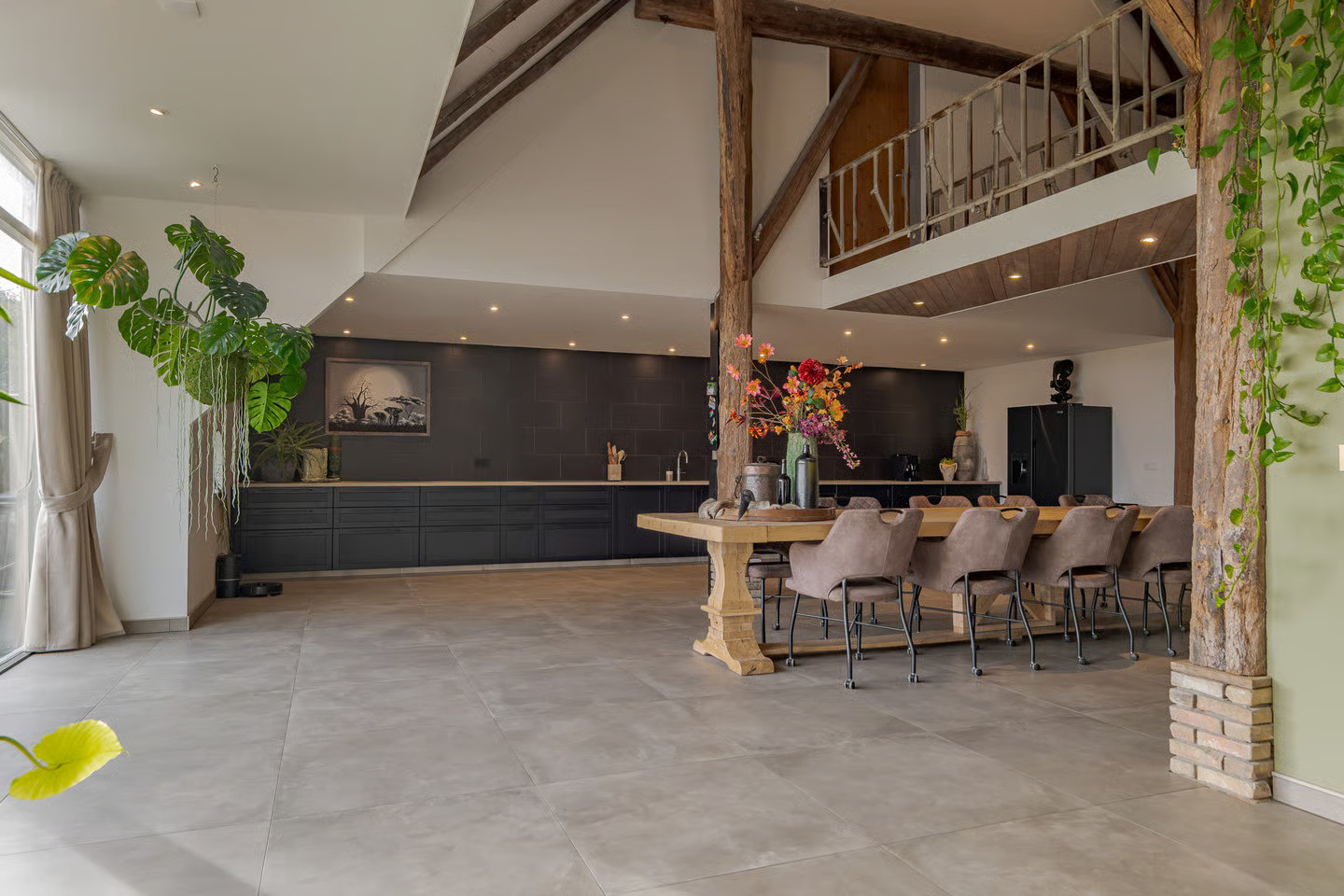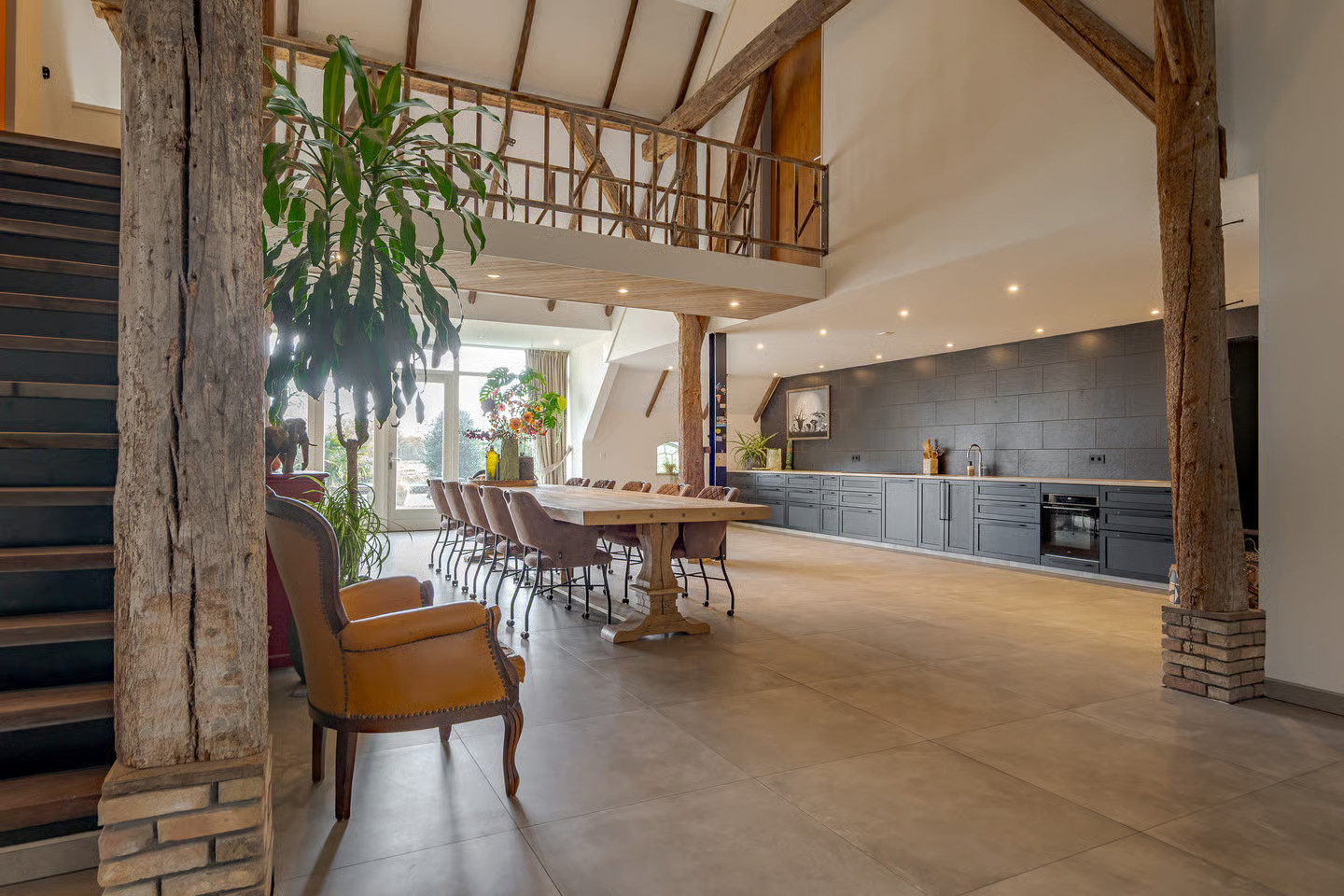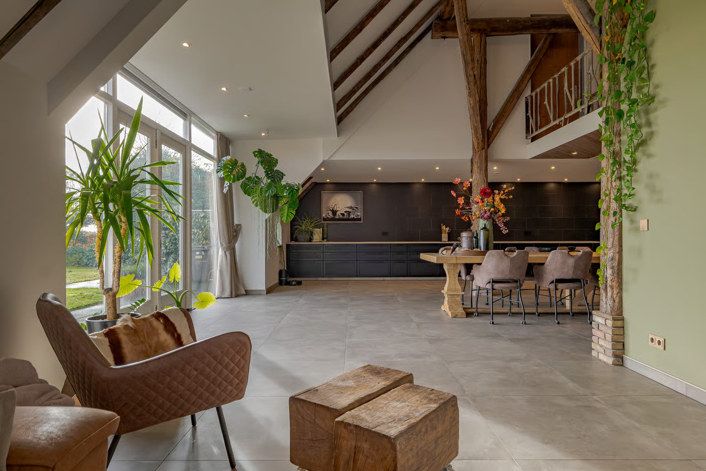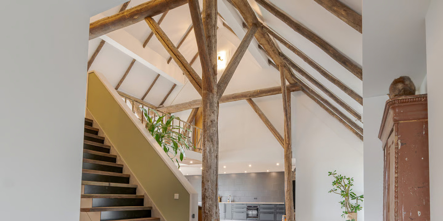 In het plaatsje Zevenhuizen, nabij Groningen, hebben we de transformatie van deze woonboerderij mogen verzorgen. Het ‘romp’-gedeelte van deze kop-rompboerderij uit 1938 troffen wij nagenoeg onaangetast aan. Vooral de kenmerkende houtconstructie van rondhout valt goed op in de hoge ruimte. Dit achterdeel van de boerderij is van opslagruimte getransformeerd naar een riante woning.